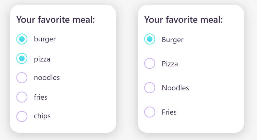 3. 완전히 동일한 UI인데, 기능이 미세하게 달라서 재사용할 수가 없었어요. 왼쪽은 여러 개를 고를 수 있는 MultiRadioButtonList이고, 오른쪽은 하나만 고를 수 있는 단일 RadioButtonList에요. 분명 똑같은 RadioButton을 나열한 리스트인데 이 둘은 다른 컴포넌트일까요?