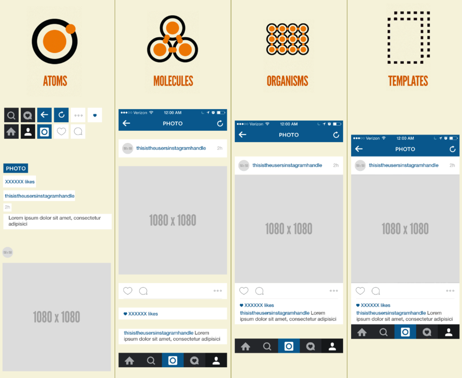 이 그림에서 atoms(아이콘, 텍스트)들이 모여서 molecules(게시글 제목, 이미지, 게시글 메뉴, 좋아요 버튼)이 되고 다시 이들이 모여서 organisms(게시글), organisms들이 모여서 화면이 됩니다.
