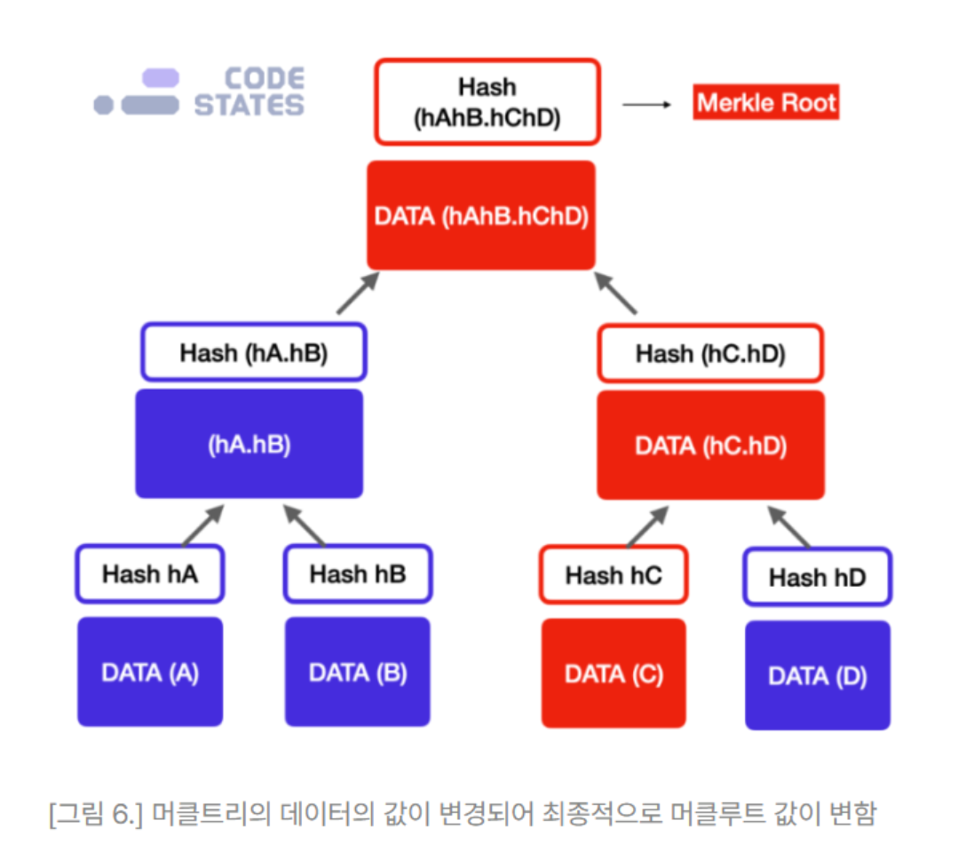 - 각 해시값들을 기반으로 만들어지기에 데이터 변조가 있을 시 해시 값이 달라지게 되며 이를 추적하면 위조된 데이터를 쉽게 파악할 수 있다.(그림의 빨간색이 변조된 데이터로 그림처럼 추적할 수 있다.)