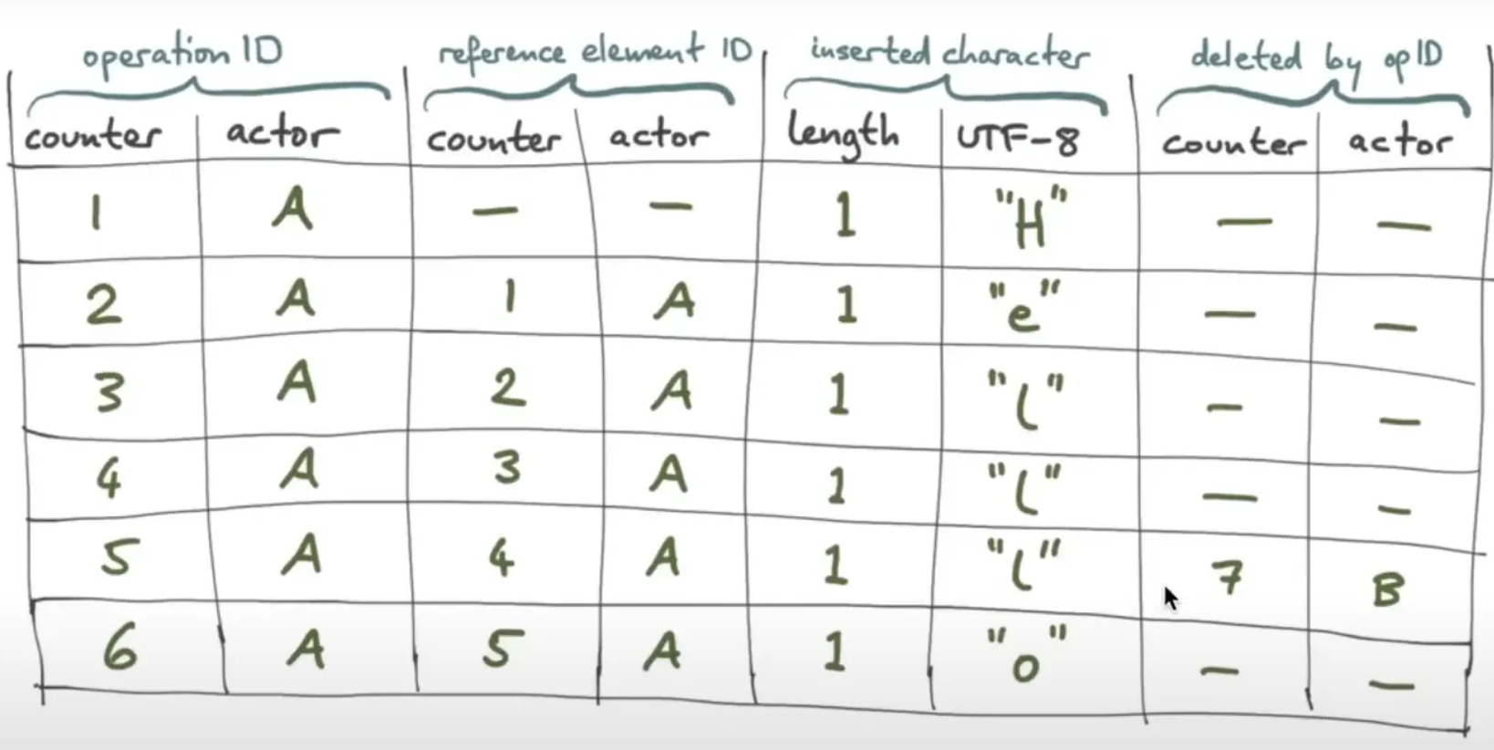 문서 편집기에 경우 사람들은 연속적으로 내용을 편집하는 경향이 있습니다. 그 내용을 표로 정리한 게 우측입니다. 이 표는 반복되거나 규칙이 있는 부분이 많지만 단순하게 객체로 표현하면 저 표를 모두 넣어야할 것입니다. 하지만, 이런 성향을 고려해서 압축하면 "RLE(6,1), RLE(A,1), ‘hello’" 로 단순하게 압축할 수 있습니다. 이런 식의 압축 알고리즘이 CRDT를 효율적으로 작동하게 만듭니다.