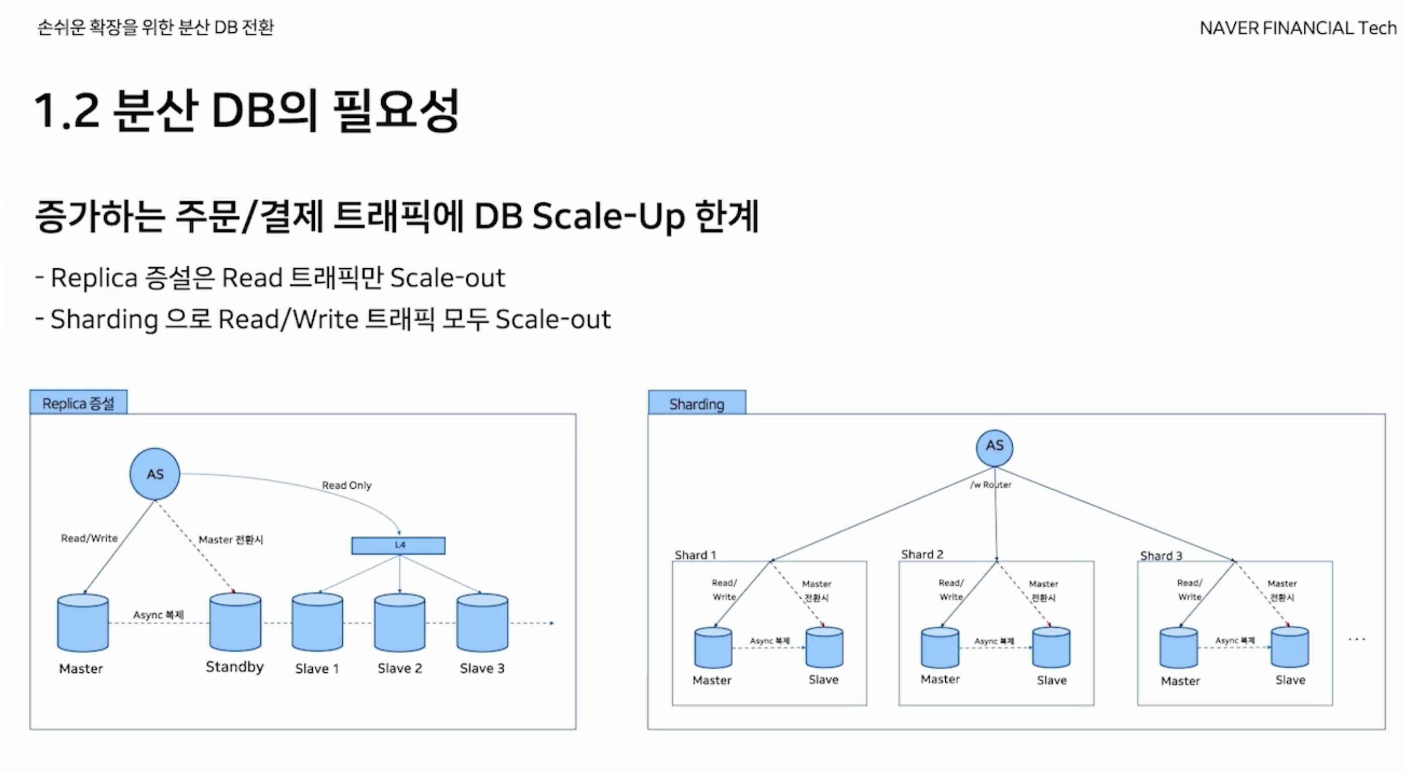 분산 DB로 모두 전향하면 좋겠지만, 네이버에서는 분산DB로는 효율이 너무 좋지 않은 서비스들이 있다. 예를 들면, 패밀리 계정 등으로 가족들을 묶어야하는 경우다. 이 경우 브로드캐스팅 쿼리를 날려야하며 이 경우는 오히려 단일 DB보다 부하를 급증시킨다. 그래서, 단일 DB를 유지해야한다.