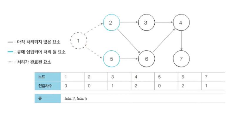 2. 큐에서 1번을 제거하고 1번이 가리키는 2, 5의 진입차수를 -1한다