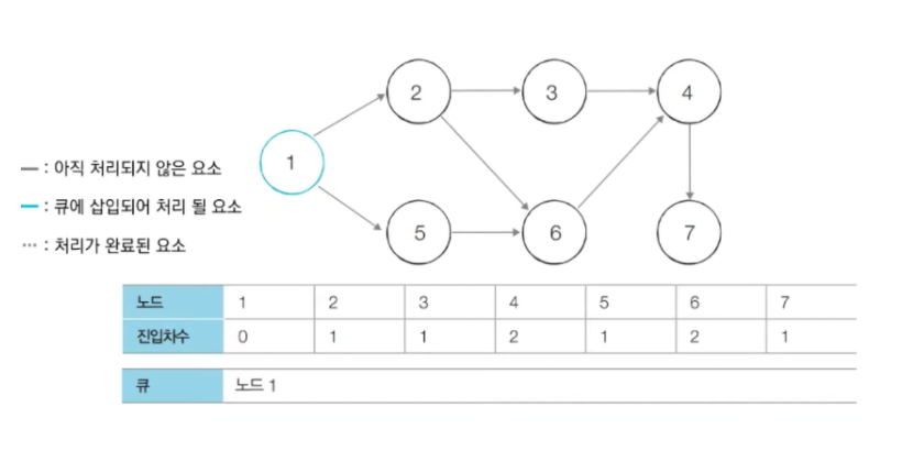 - 진입차수가 0인 노드를 큐에 넣는다.