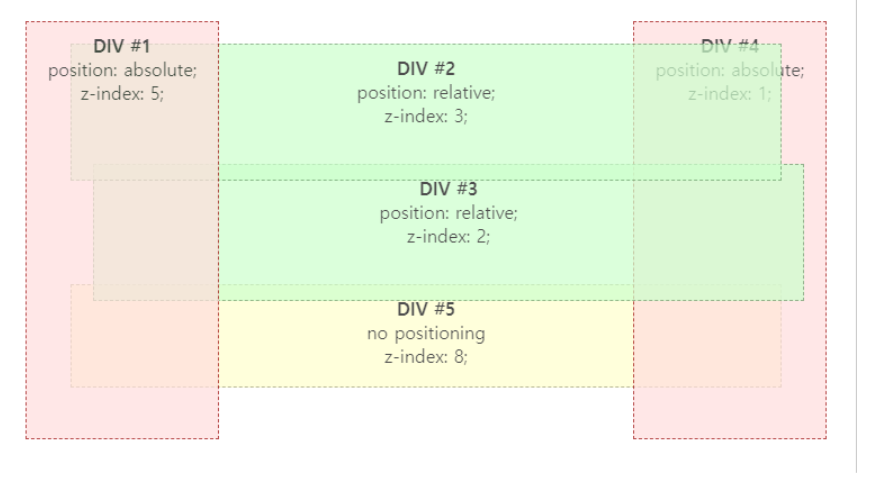 - 이 경우 div#5는 포지션이 없기 때문에 가장 먼저 나타나서, z-index는 가장 높지만 가장 바닥에 깔린다.