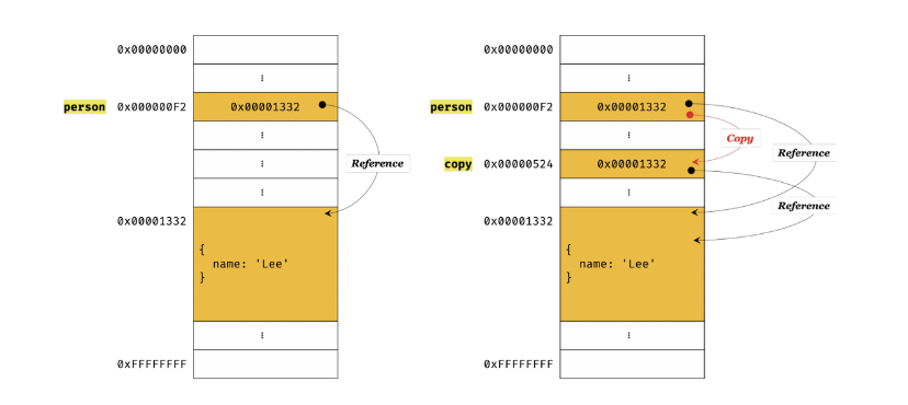 위 그림처럼 person과 copy는 모두 0x00001332를 가리키고 0x00001332가 변하면 양쪽 다 영향이 가게된다. (위 얕은 복사 예시 참조)